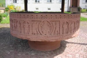 Treffpunkt: an der romanischen Brunnenschale im Hofraum vor der Kirche